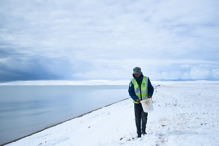 2021年10月,三江源国家公园黄河源园区生态管护员俄措在扎陵湖边捡拾垃圾。新华社记者张龙摄
