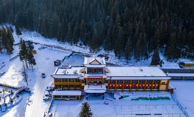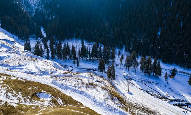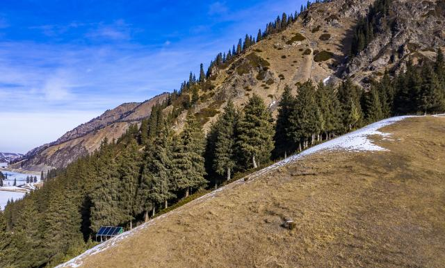 正如你所见,进入天山大峡谷,满目的雪岭云杉。这里正是天山北坡最完整的、最具观赏价值的原始雪岭云杉林。透过皑皑白雪和那茂密的杉林,褐红色的山脉清晰可见。
