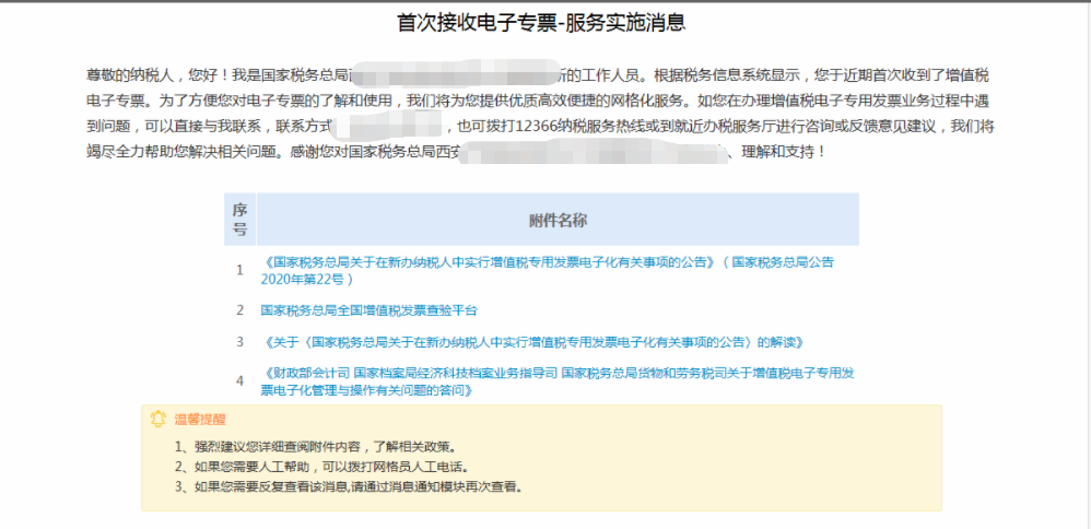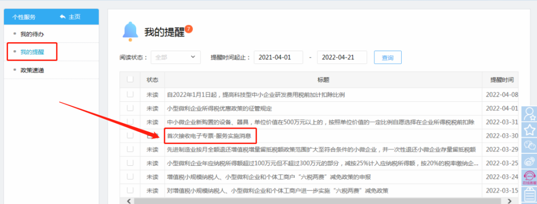 答:【我的信息】-【我的提醒】-【首次接收电子专票-服务实施消息】内进行确认即可。