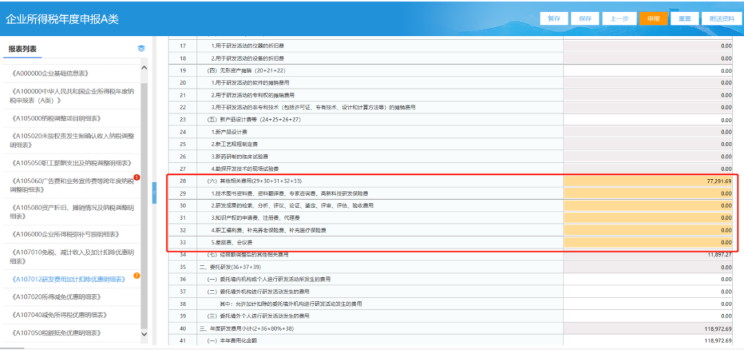 问:申报企业所得税年度申报A表中的《A107012研发费用加计扣除优惠明细表》29-33行标黄且填写不了是什么原因?