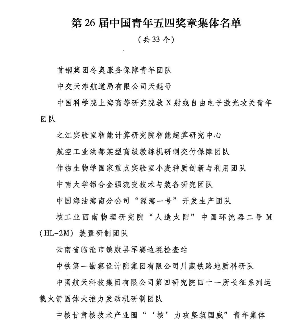 以下为第26届中国青年五四奖章集体名单: