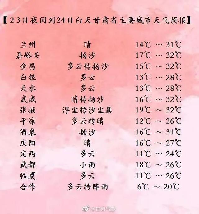 明天夜间到后天白天,甘南、临夏、陇南、天水、定西等州市多云,部分地方阴有阵雨或雷阵雨,局部地方有中雨;平凉、庆阳两市晴间多云,局部地方阴有阵雨或雷阵雨;省内其余地方晴或多云,祁连山区阴有小雨或雨夹雪。另外,河西五市及白银市北部有5级左右偏东风,并伴有扬沙或浮尘。