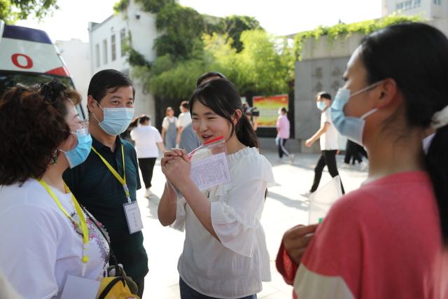 6月8日下午,甘肃省普通高考最后一科英语考试结束后,一名天水市五中的学生双手抱拳向领队老师表示谢意。