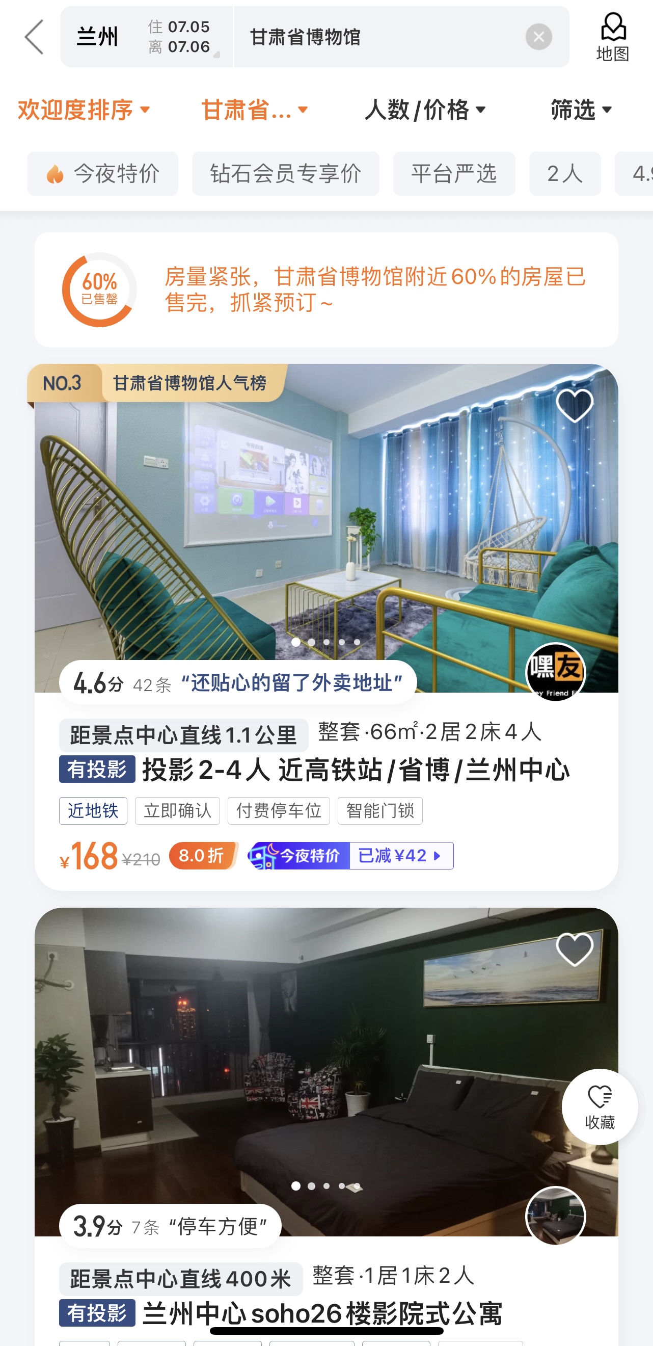 澎湃新闻搜索发现,以7月5日入住7月6日退房为例,搜索甘肃省博物馆周围的民宿显示“房量紧张,甘肃省博物馆附近60%的房屋已售完”。
