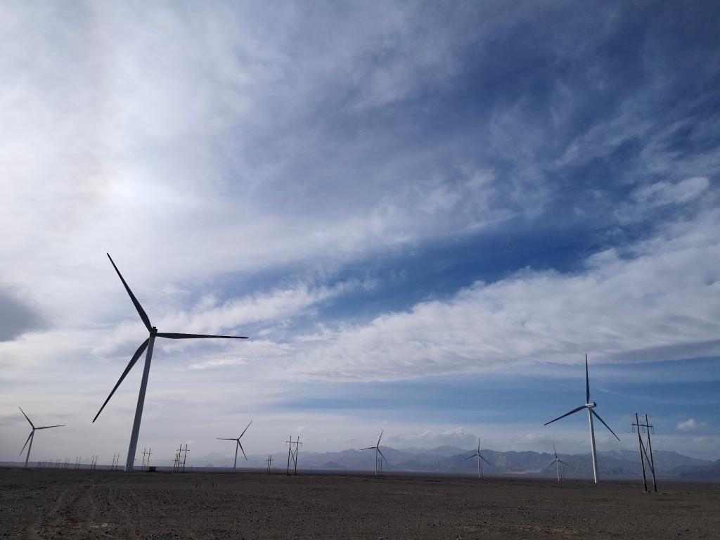 这是2022年7月4日拍摄的中广核青海冷湖风力发电有限公司茫崖5号平摊100兆瓦风电项目一角。(新华社发)